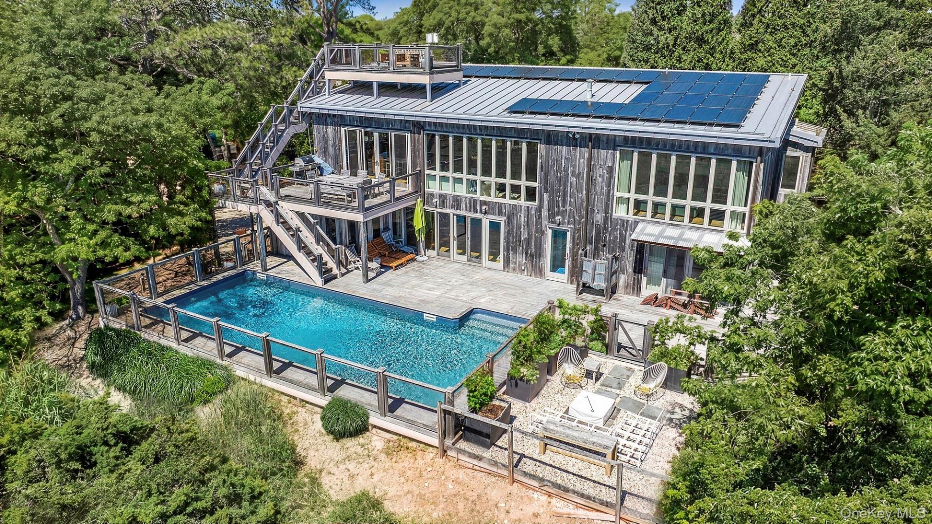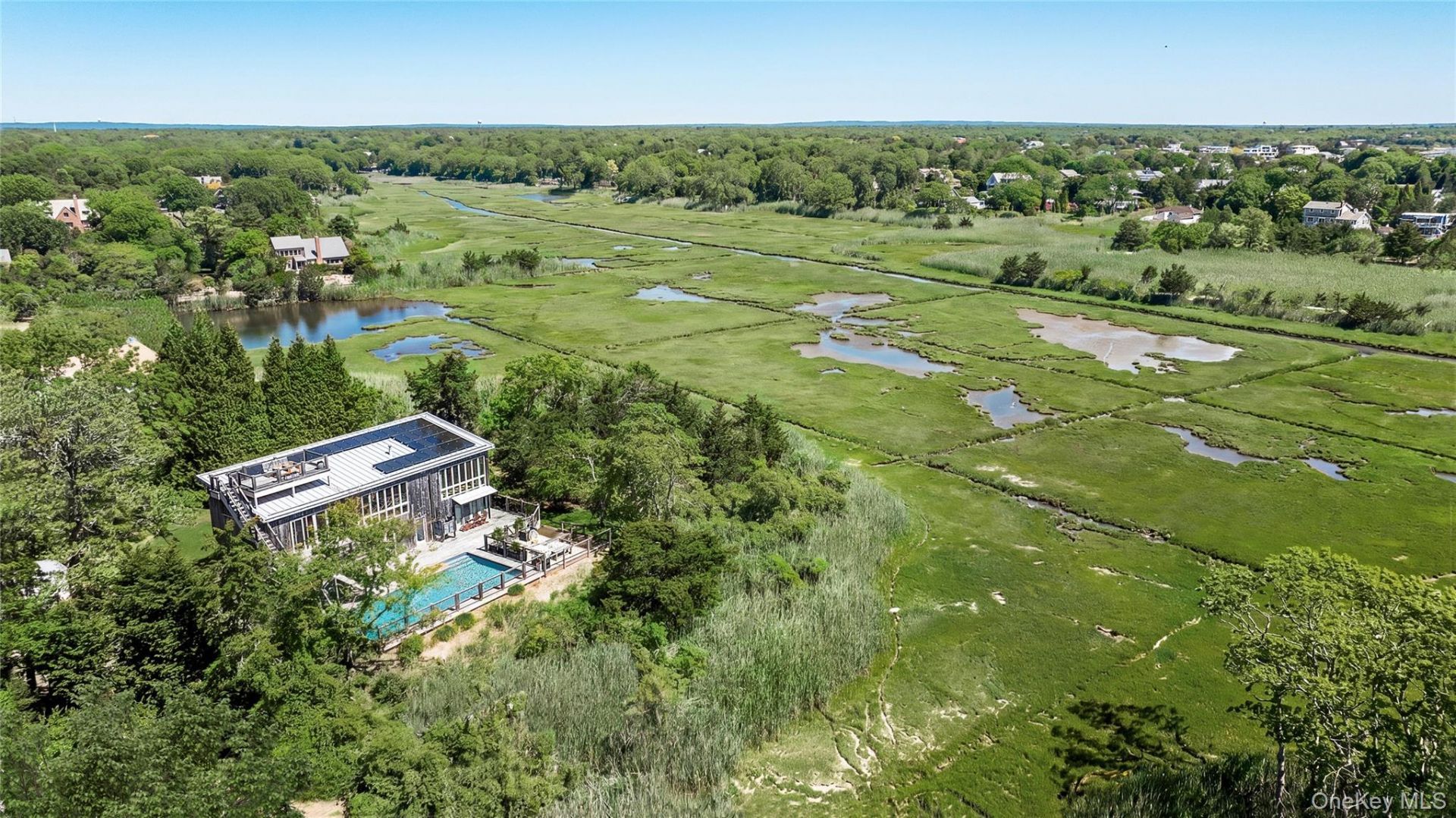 Live amidst nature in this Waterview Contemporary Home remodeled by George Vickers offering Peace & Tranquility. The 3 south facing decks overlooking 20 acres of Breathtaking views of Preserve, Ponds & Moriches Bay will leave you in awe. This Unique Home is dressed in reclaimed Pennsylvania barnwood with modern green features such as rooftop solar panels & meets LEEDS certified standards, an environmentally friendly home. Sunlight floods in through 3 walls of windows on the main level illuminating the open kitchen, dining room & high ceiling living room with double sided fireplace. All high-end kitchen appliances by Miele, Liebherr, & Dacor. The main level also includes a spacious, light filled, en-suite primary bedroom & office. In addition, there are 3 bedrooms, a den & an additional large room currently being used as a Billard room with wet bar. The heated saltwater pool is surrounded by an Epay deck with grill, seating area & outdoor shower. A firepit, espaliered trees, herb garden & fenced in back yard round out this very special home. There is also a Rooftop deck with panoramic views. All this just a few miles from Westhampton Beach & all that it offers.